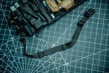 A backstrap for chest rigs... but with stretch! The back portion of our backstrap features two layers of elastic to provide breathability and allow the user to tighten the backstrap more than they might normally. On either side of the backstrap are triglides for a range of adjustment.